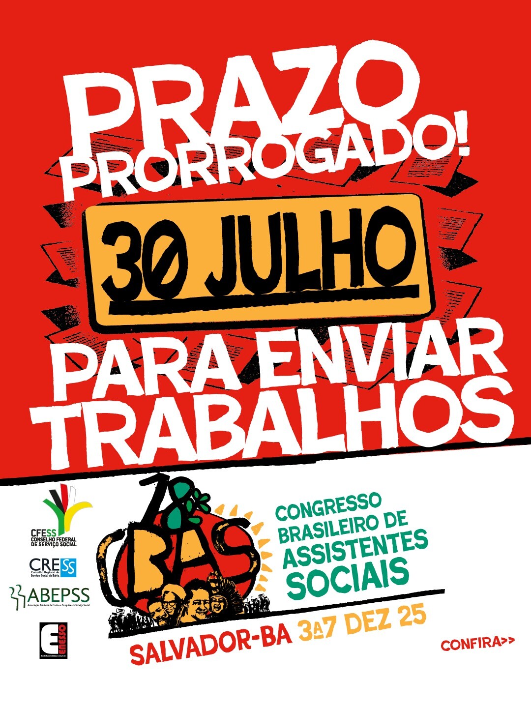 Você ainda não enviou seu trabalho para o 18º Congresso Brasileiro de Assistentes Sociais? Agora você tem mais tempo! O prazo de submissão foi prorrogado até 30 de julho de 2025, às 23h59 (horário de Brasília).