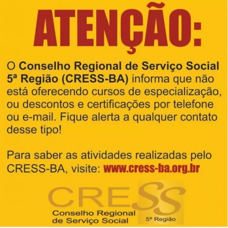 O Conselho Regional de Serviço Social - 5ª Região (CRESS-BA) informa que o nome da entidade está sendo utilizado de forma indevida para oferecimento de cursos de especialização, descontos e certificações.