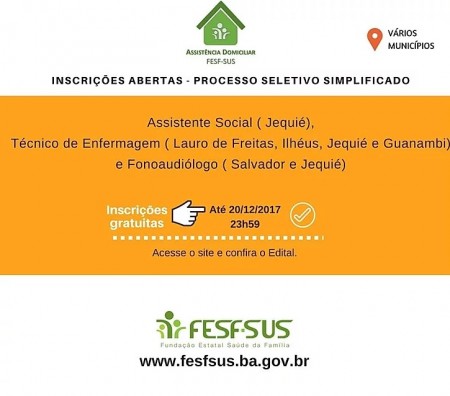 A FUNDAÇÃO ESTATAL SAÚDE DA FAMÍLIA – FESF-SUS, nos termos do art. 37, incisos I a IV e IX a XVI da Constituição Federal, dos arts. 442 a 445 e 451 da Consolidação das Leis Trabalhistas, bem como da Deliberação n.º 20, de 21 de maio de 2010, do Conselho Curador, que dispõe sobre o Regulamento da Contratação de Empregados por Prazo Determinado, torna pública a realização do Processo de Seleção Simplificada deassistente social, fonoaudiólogo e técnico de enfermagem, para compor as Equipes de Internação Domiciliar da FESF-SUS, com vistas ao cumprimento da transitória necessidade do desenvolvimento de ações e serviços especializados em Internação domiciliar destinado a pacientes dos hospitais da rede própria do Estado e aos pacientes com doenças neuromusculares oriundos da Rede SUS, em conformidade com o desenvolvimento de serviços descritos do 6º Termo Aditivo do Contrato de Programa nº 0300100035034, celebrado com o Governo do Estado da Bahia, através da Secretaria de Saúde, mediante os termos e condições deste Edital.