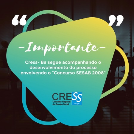 O Conselho Regional de Serviço Social da 5ª Região – Bahia, informa que segue acompanhando o desenvolvimento do “Concurso SESAB 2008”, que envolve diversas categorias profissionais, incluindo as/os assistentes sociais, e traz a público algumas informações importantes para essa categoria profissional: